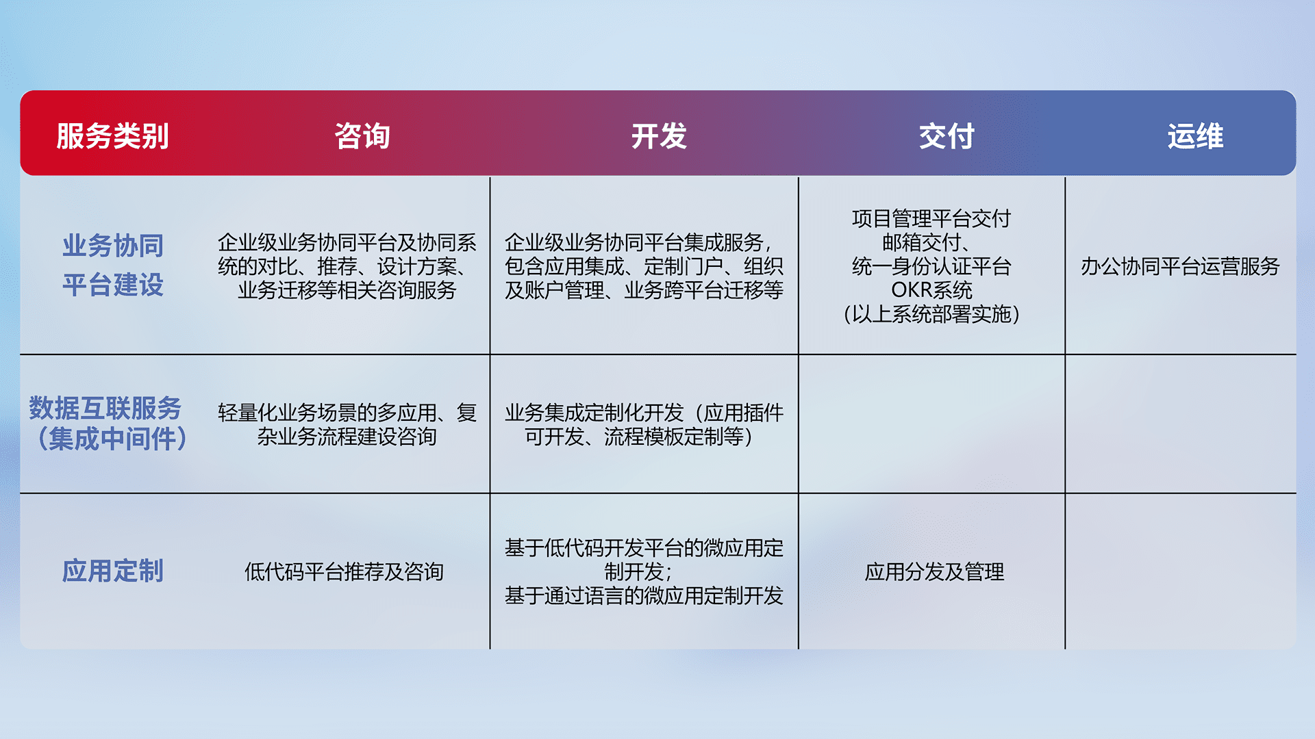 针对钉钉、、、、企微、、IDaas等平台级产品提供产品的规划、、、方案、、、、交付、、定制化开发等服务,,实现如统一协同办公、、智能客户服务、、混合会议管理、、、智能数据查询、、、等业务场景,,,实现数字化转型。。