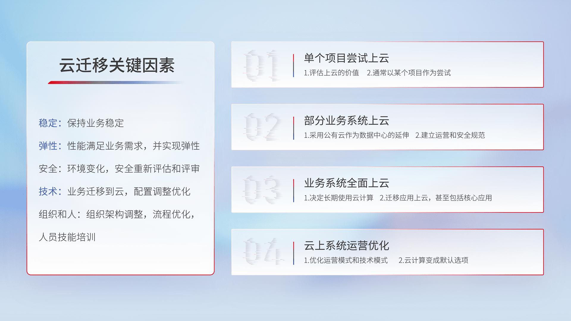 结合实际业务,,,,从规划设计、、、、云平台选型、、、云原生改造、、、数据迁移、、、集成交付,,迁移全过程为客户识别最佳上云路径,,,做好风险识别管理,,设计网络架构、、、身份权限、、安全审计合规、、、操作审计、、、、日志审计、、监控告警策略、、、、多站点容灾设计等,,,对云上基础设施进行整体规划,,,提升IT治理水平,,,,以满足弹性、、高可用、、、高性能的需求。。。。